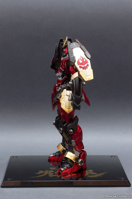Il modello è imponente e pesante data la massiccia presenza di metallo che non si limita solo alle strutture interne e agli snodi, ma si affaccia anche abbondantemente in superficie. Come già detto gli scudi delle spalle sono quasi interamente in metallo, tutti gli snodi di spalle, gomiti, anche, ginocchia e caviglie, la porzione superiore delle braccia, le cosce, i piedi e altri dettagli sparsi, non mi sono messo a fare il censimento completo.